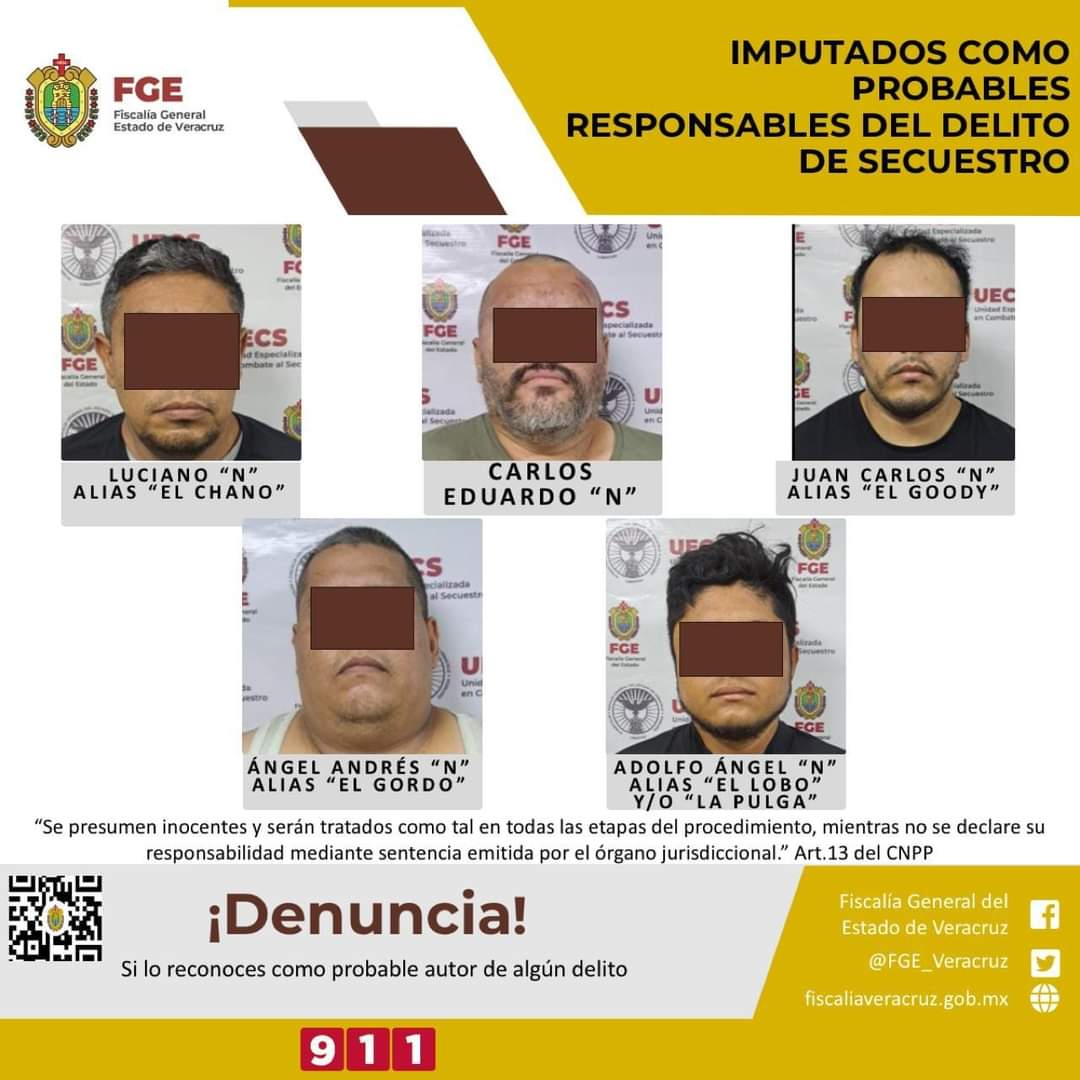 Xalapa, Ver., a 17 de junio del 2024.- La Fiscalía General del Estado informa que, a través de la Unidad Especializada en Combate al Secuestro, realizó imputación en contra de Juan Carlos “N” alias “El Goody”, Luciano “N” alias “El Chano”, Adolfo Ángel “N” alias “El Lobo” y/o “La Pulga”, Ángel Andrés “N” alias “El Gordo” y Carlos Eduardo “N” como probables responsables del delito de secuestro en agravio de siete personas y una menor de edad, de origen Venezolano, Hondureño y Colombiano, así como de la víctima J.L.B.C.Hechos ocurridos el pasado día viernes 14, en el municipio de Tierra Blanca, donde en una primera acción, se realizó la detención de Adolfo Ángel “N” alias “El Lobo” y/o “La Pulga” como probable responsable del delito de secuestro en agravio de la víctima J.L.B.C., quien fue privada de su libertad el 4 de junio del año en curso y posteriormente mediante un operativo de pago controlado, fue detenido Adolfo Ángel “N” y la víctima fue liberada.